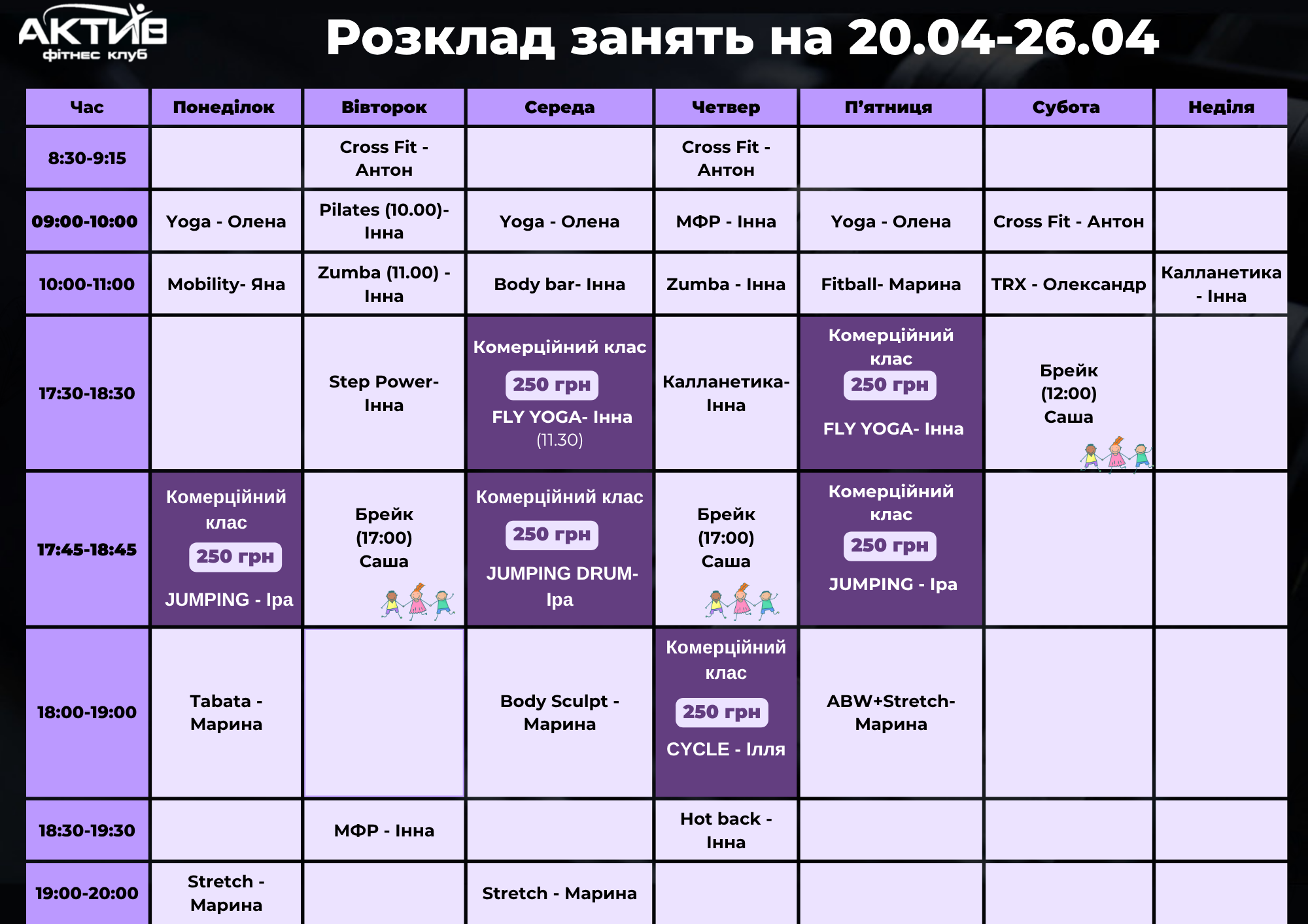 Заняття діляться на силові класи,функціональні, танцювальні, а також класи напряму Mind & Body. Розклад складено таким чином, що впишеться в графік будь-якого клієнта. Ви самостійно обираєте на яке з занять Ви ідете і скільки разів на тиждень відвідуєте заняття. В залежності від цього можна обрати абонемент.